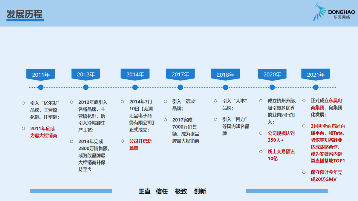 蕪湖東昊網(wǎng)絡(luò)科技有限公司,成立于 2014 年,是一家以互聯(lián)網(wǎng)平臺(tái)銷售為核心的電子商務(wù)運(yùn)營商,公司成立以來,始終專注于休閑運(yùn)動(dòng)鞋的互聯(lián)網(wǎng)銷售業(yè)務(wù),產(chǎn)品線覆蓋硫化鞋、注塑鞋、冷粘鞋,在互聯(lián)網(wǎng)二級(jí)類目單品牌排名前三,綜合成績排名TOP1;